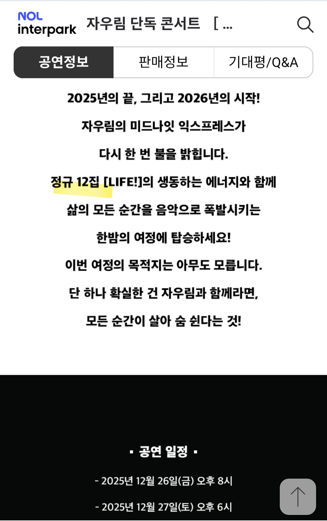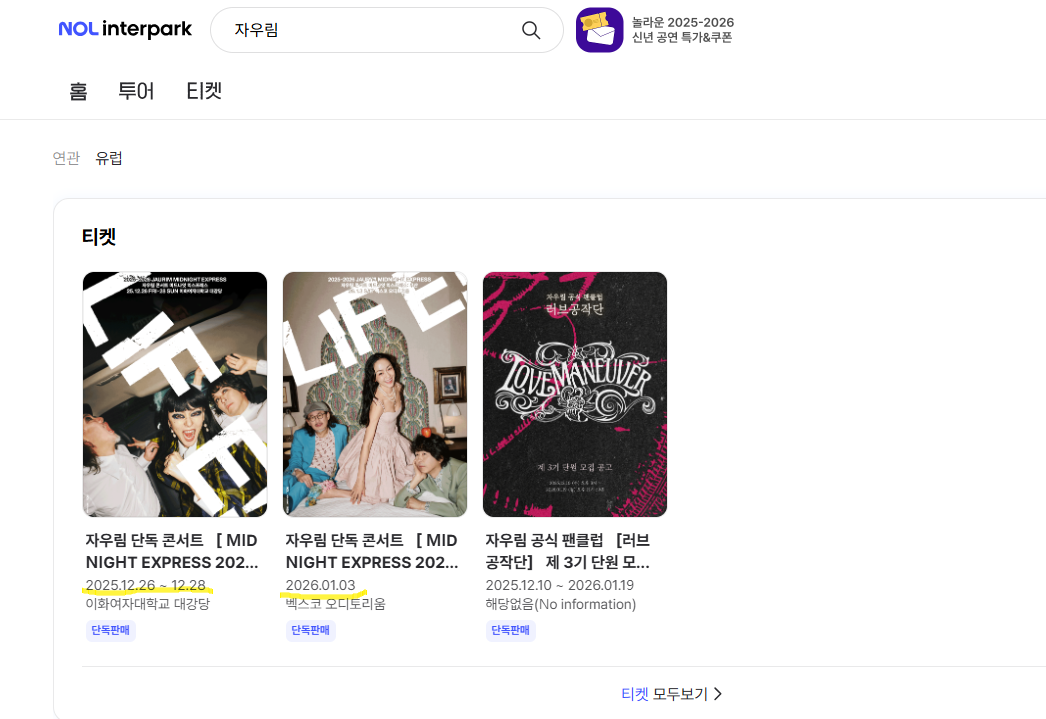 이번 자우림 콘서트는 12월 26일 ~28일 이화여자대학교 강당에서 시작하여 1월 3일 엑스코 오디토리움에서 끝이 납니다.