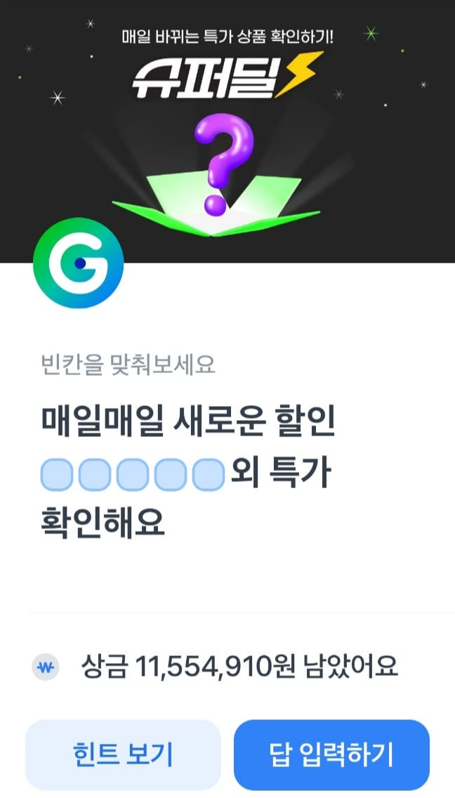 빈칸에 들어갈 말을 맞추면 됩니다. 그럼 정답을 알아보기 위해서 힌트 보기를 누르면 지마켓으로 이동합니다.