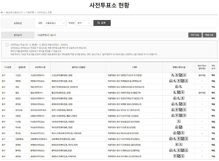 - 지역명이나 주소를 입력하여 가까운 사전투표소를 확인합니다.