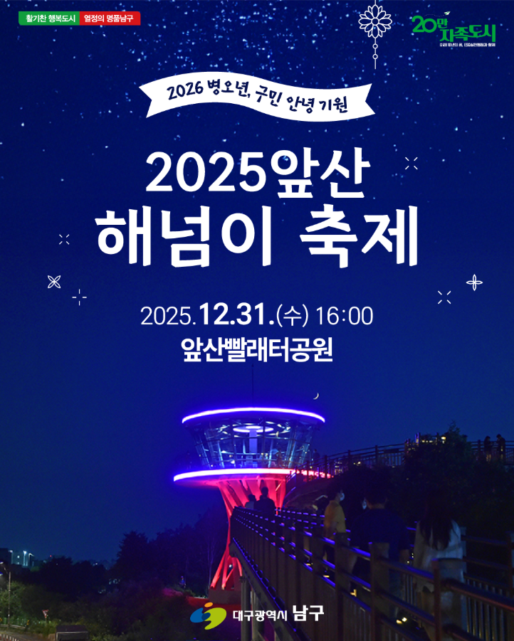 2025년 한 해를 아름답게 마무리할 수 있는 ‘2025 대구 앞산 해넘이 축제’가 올해도 어김없이 대구 남구 앞산빨래터공원에서 개최됩니다! 한 해를 보내고 새해를 맞이하는 송구영신(送舊迎新)의 의미를 가득 담은 이 축제는 가족·연인·친구 누구와 함께 가도 좋습니다. 대구의 명소인 앞산에서 2025년을 마무리 해 보세요.