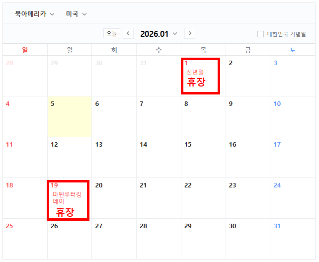 2026년 미국 증시 정규 휴장일(한국시간 기준 포함)