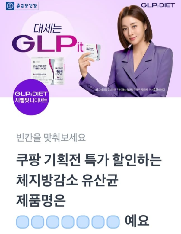 문제 : 쿠팡 기획전 특가 할인하는 체지방감소 유산균 제품명은 ㅇㅇㅇㅇㅇㅇㅇ예요.