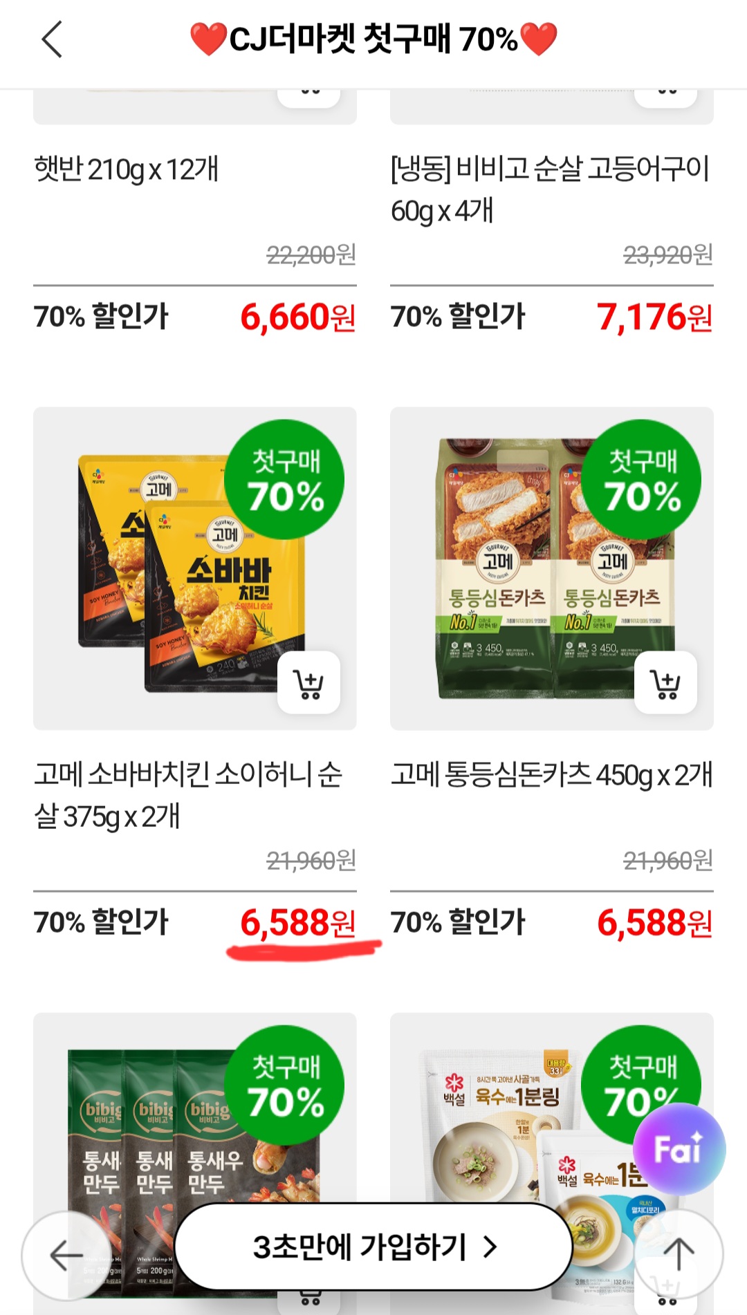 cj더마켓이 처음이라면 70%할인된 가격으로 집에서 맛있고 손쉽게 먹을 수 있는 치킨이 2봉에 6588원입니다.