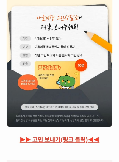 문제 : 마음여행 ㅇㅇㅇㅇㅇ에 고민을 보내면 추첨을 통해 선물을 드려요.