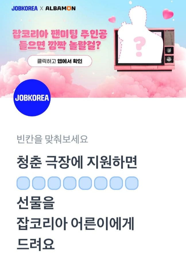 문제 : 청춘 극장에 지원하면 ㅇㅇㅇㅇㅇㅇㅇㅇ선물을 잡코리아 어른이에게 드려요.