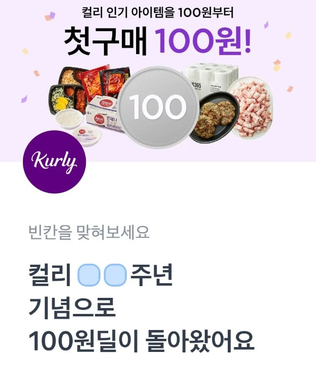 문제 : 컬리 ㅇㅇ주년 기념으로 100원딜이 돌아왔어요.