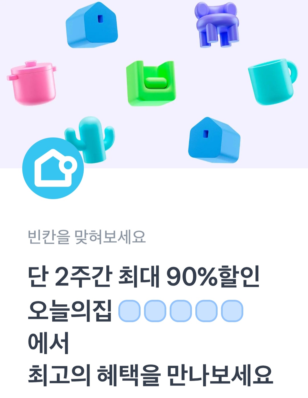 문제 : 단 2주간 최대 90%할인 오늘의 집 ㅇㅇㅇㅇㅇ에서 최고의 혜택을 만나보세요.