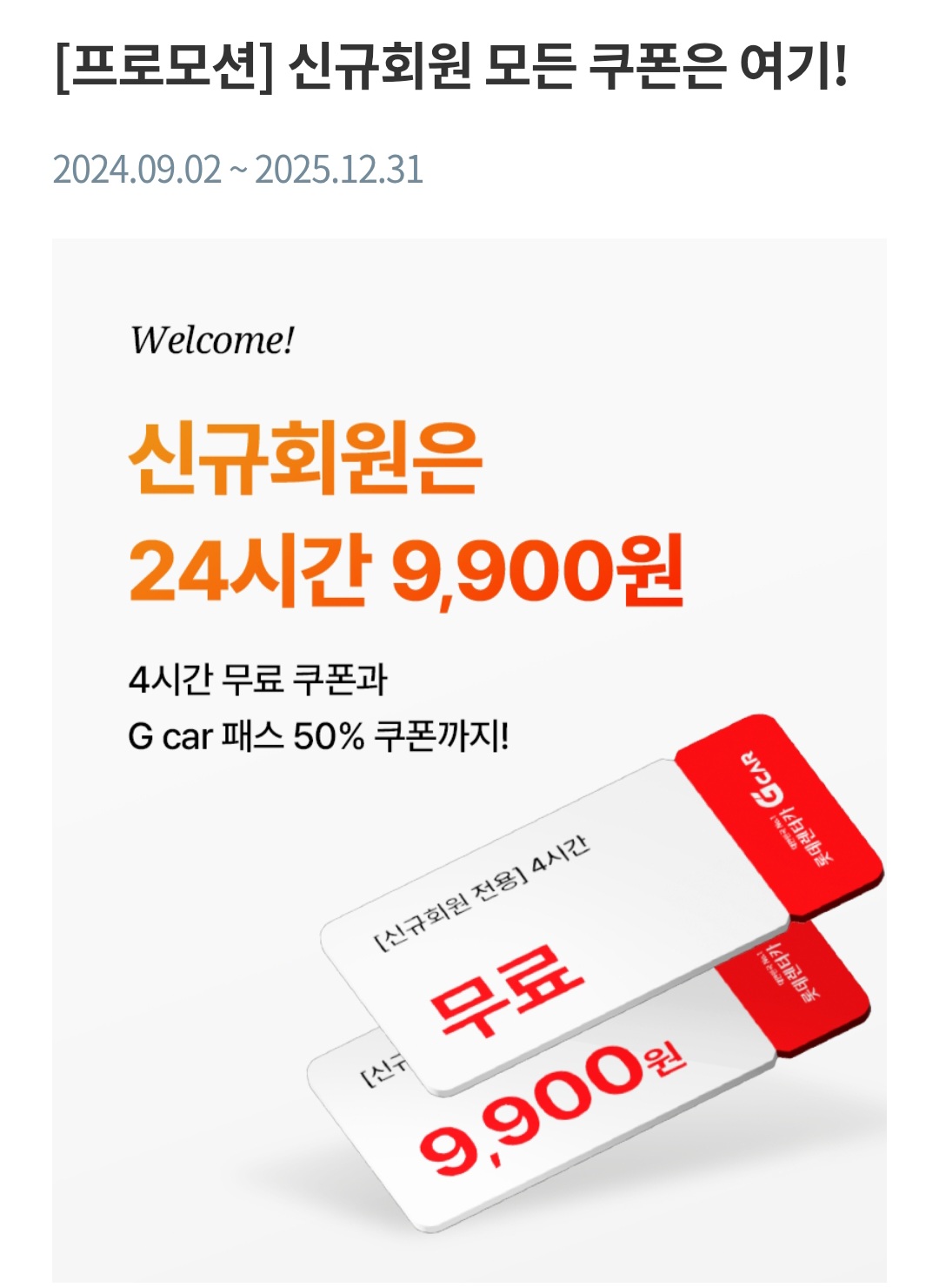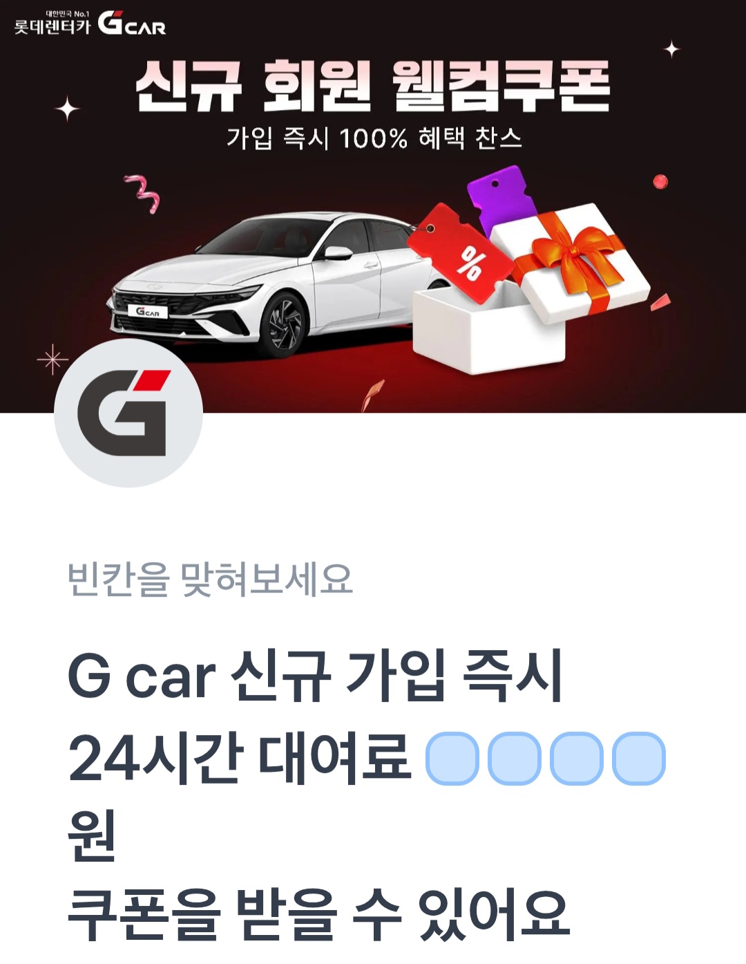 문제: G car 신규가입즉시 24시간 대여료 ㅇㅇㅇㅇ원 쿠폰을 받을 수 있어요.