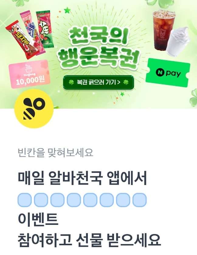 문제 : 매일 알바천국 앱에서 ㅇㅇㅇㅇㅇㅇㅇㅇ 이벤트 참여하고 선물 받으세요