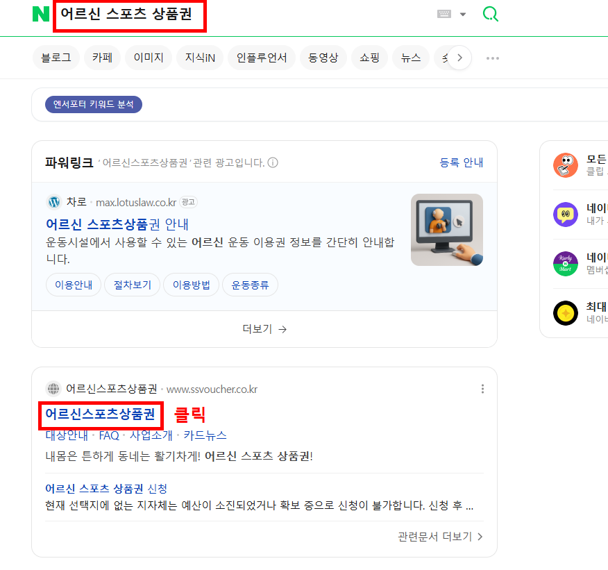 제일 먼저 네이버나 다음 포털 사이트에서 '어르신 스포츠 상품권'을 검색합니다.