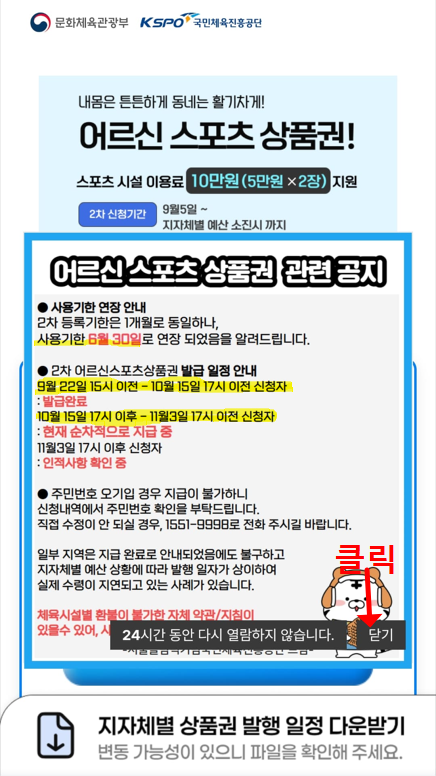 어르신 스포츠 상품권을 클릭하면 메인홈페이지로 들어가게 됩니다. 팝업창에 발급 일정 관련 공지사항이 뜨지만 무시하시면 됩니다. 각 지자체별로 시행하고 있어 금액이 소진되지 않은 지역은 아직 신청이 가능합니다. 엄마가 계신 대구지역은 아직 신청이 가능하더라고요. 처음 팝업을 보고 기간이 끝났다고 생각했는데 일단 신청해 보자는 생각으로 했더니 신청이 되었습니다.