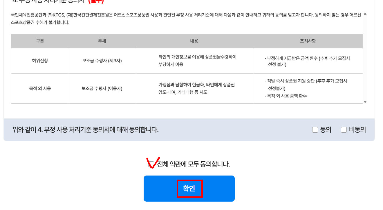 개인정보 수집 및 이용 동의서에 전체 '동의'를 체크하고 확인 눌러주세요.