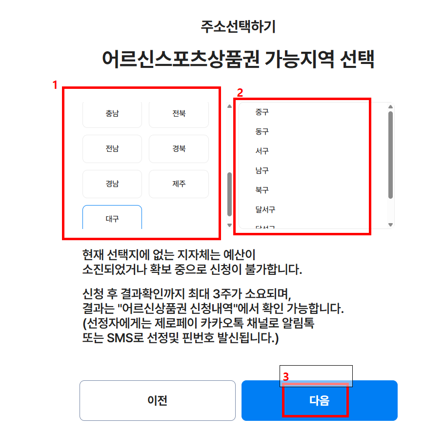친정엄마 지역인 대구를 선택 후 '구'를 선택하고 다음을 클릭하시면 화면이 넘어갑니다.