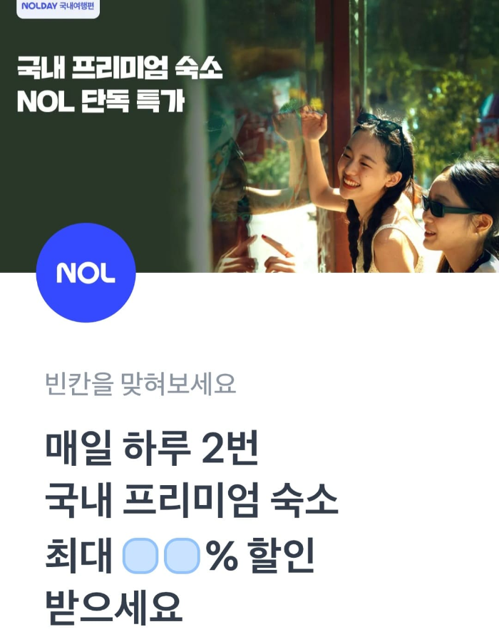 문제 :  매일 하루 2번 국내 프리미엄 숙소 최대 ㅇㅇ% 할인받으세요.