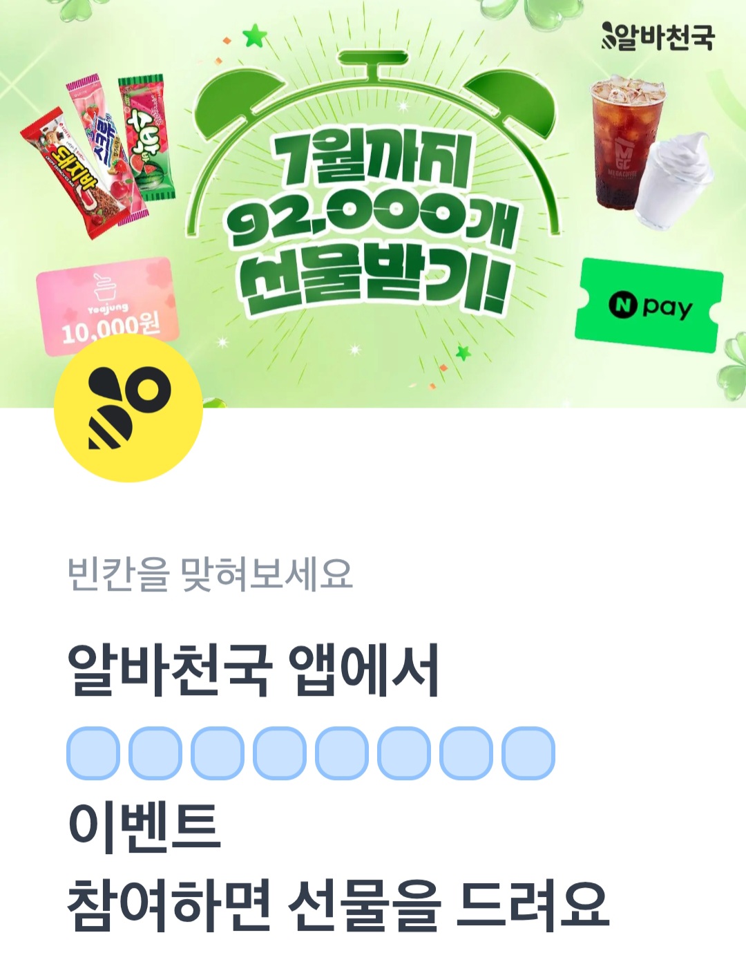 문제 : 알바천국 앱에서 ㅇㅇㅇㅇㅇㅇㅇ이벤트 참여하면 선물을 드려요