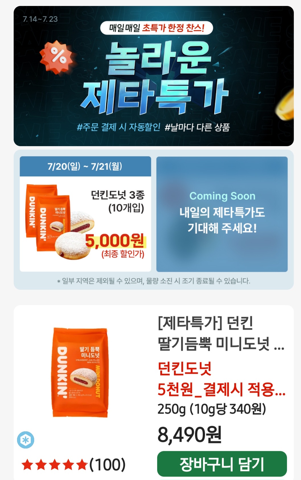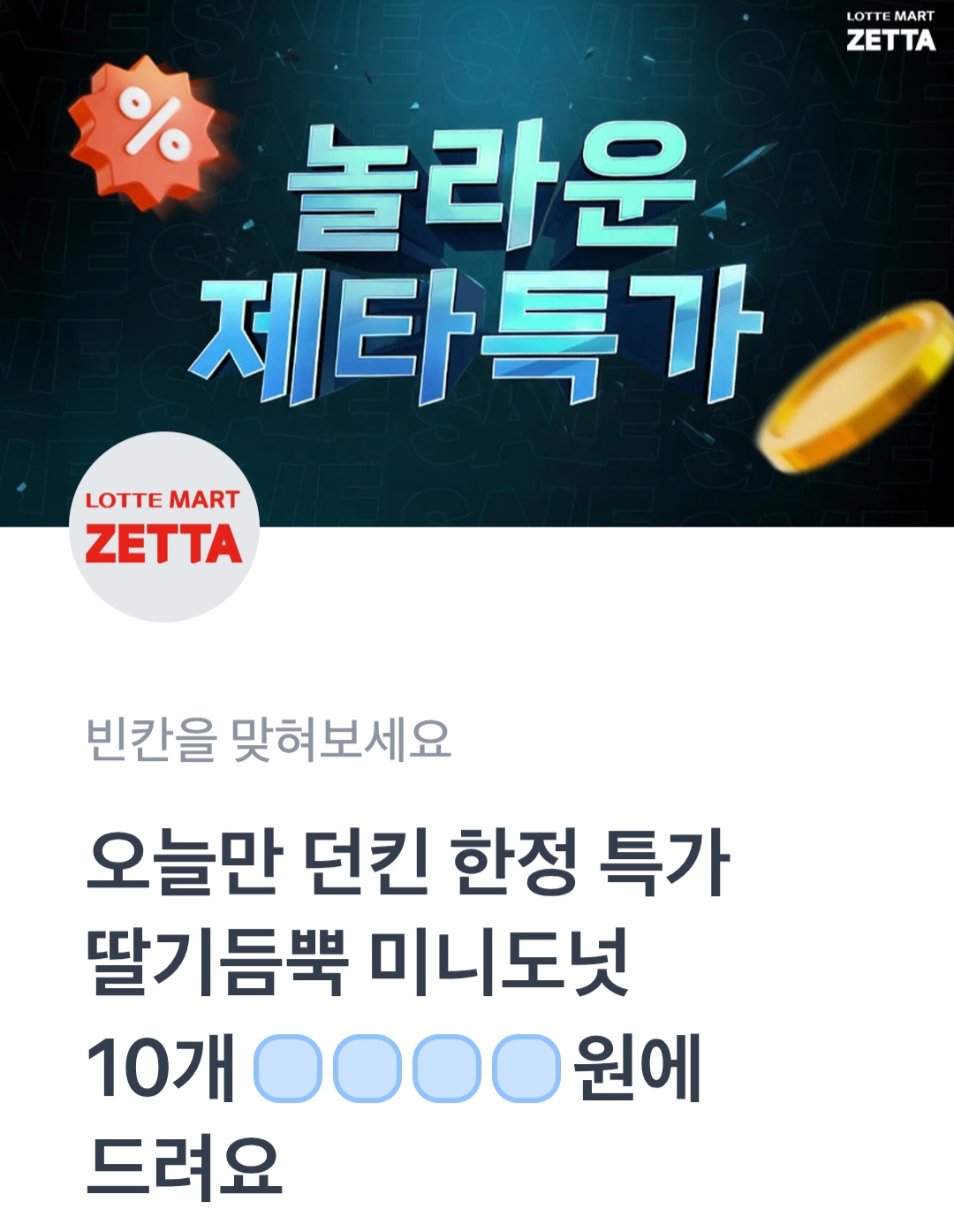문제: 오늘만 던킨 한정 특가 딸기듬뿍 미니도넛 10개 ㅇㅇㅇㅇ원에 드려요