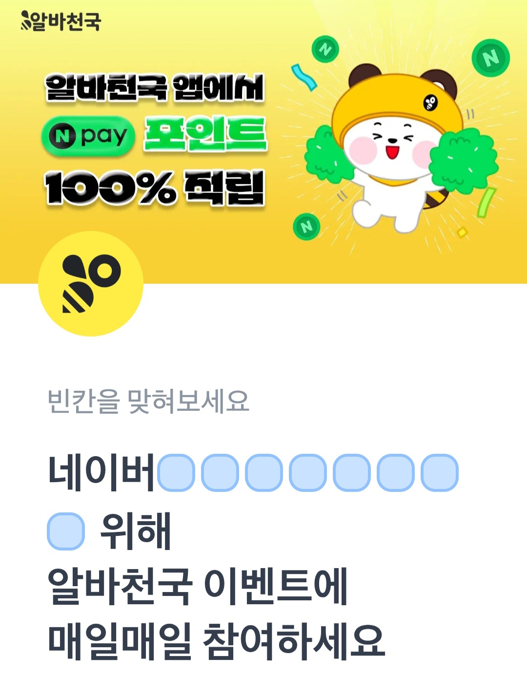 문제 : 네이버 ㅇㅇㅇㅇㅇㅇㅇㅇ 을 위해 알바천국 이벤트에 매일매일 참여하세요.