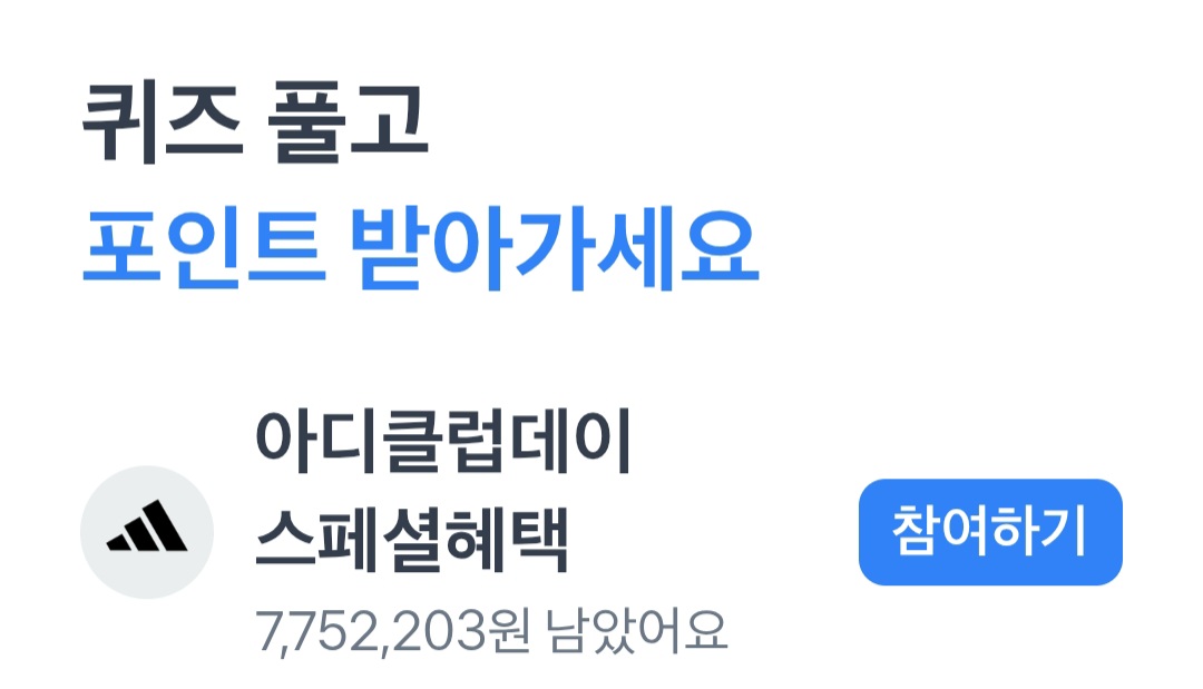 일단 얼른 정답 입력하시고 토스 포인트 먼저 받아주세요. 그리고 손흥민 선수의 팬분들은 어서 서둘러 아이다스 앱 깔고 이벤트 응모하셔서 행운이 따르길 바라겠습니다.