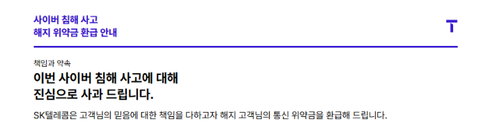 2025년 SK텔레콤에서 발생한 개인정보 유출 사고에 대해 회사 측은 공식 사과문을 통해 “개인 정보 보호에 대한 책임을 통감한다”는 입장을 발표했고, 다양한 보상 프로그램을 내놓았습니다.