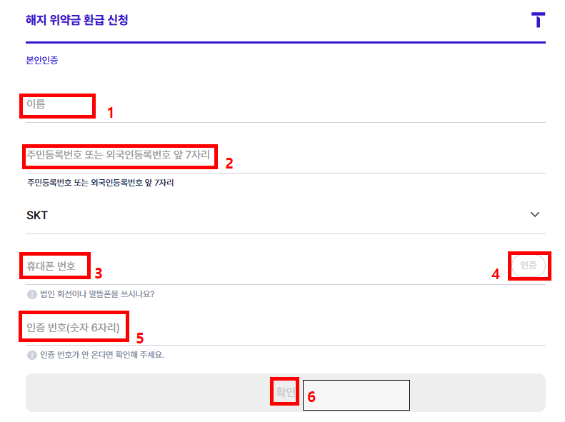 - T월드 → 해지위약금조회/환급신청 → 아래 사진의 순서대로 본인 인증하기 → 완료