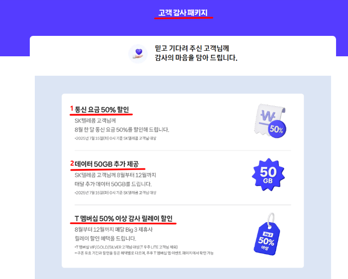 • 재가입 고객 혜택 : 2025년 4월 19일(토) ~ 7월 14일(월) 사이 SK텔레콤을 해지하고 7월 15일(화) 이후 다시 가입하신 고객, 해지일로부터 6개월 이내 재가입하거나 해지일로부터 6개월 안에 고객 정보 보관 동의 후 해지일로부터 3년 이내 재가입시 가입정보 복원