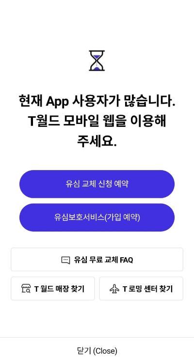 T월드 앱 실행 또는 홈페이지 접속 : 현재 접속자가 많아 대기 시간이 5분 이상 걸릴 수도 있습니다.