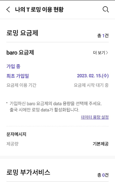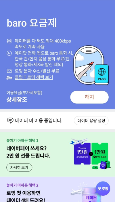 나의 T로밍 이용현황을 누르면 나오는 화면에서 더 보기를 눌러 요금제 페이지로 들어갑니다. 그리고 해지를 눌러주세요.