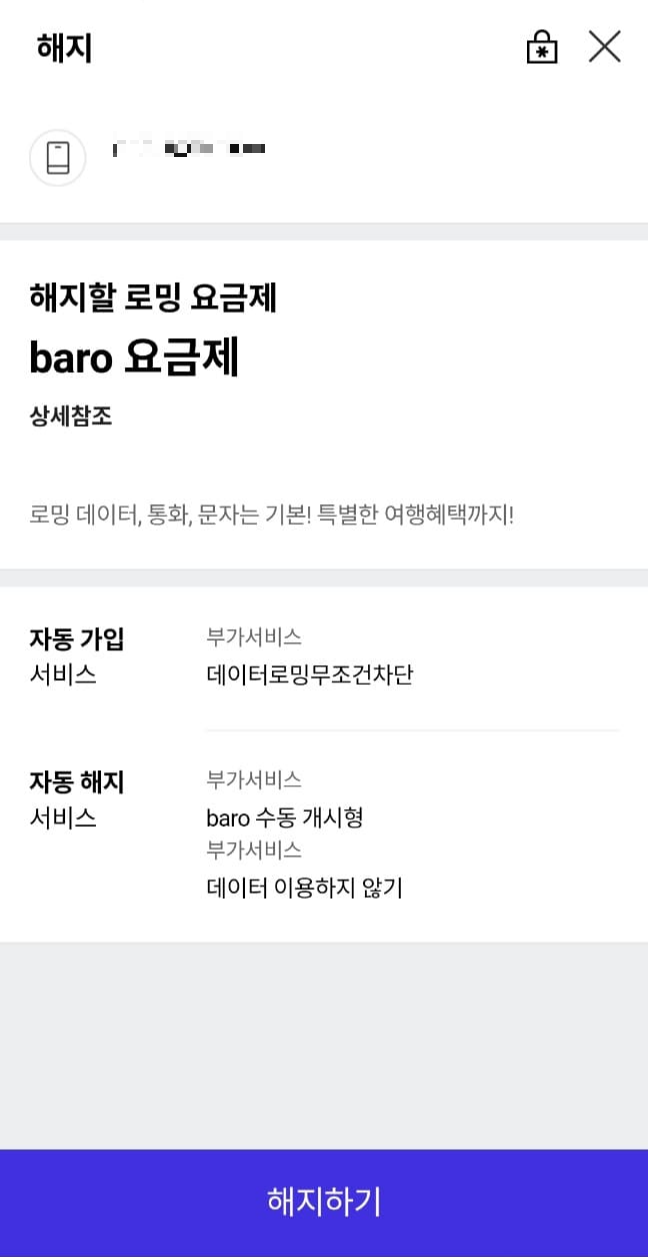 이 화면에서 해지를 누르면 로밍서비스가 해지되고 유심 보호 서비스를 가입할 수 있게 됩니다.