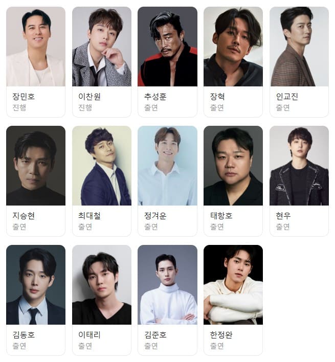 잘생긴 트롯의 MC는 대한민국의 대표 트롯 남자가수 장민호와 이찬원이 맡게 되었으며 격투기 선수 출신의 추성훈, 배우 장혁, 최대철, 인교진, 지승현, 정겨운, 태항호, 현우, 김동호, 이태리, 펜싱 금메달리스트 김준호, 그리고 미남 선발대회 우승자 한정완까지 총 12명의 스타들이 출연합니다. 이들은 각자의 분야에서 인정받은 인물들로, 트로트 가수로서의 새로운 도전에 나섭니다.